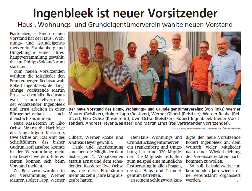HNA Bericht - Ingenbleek ist neuer Vorsitzender